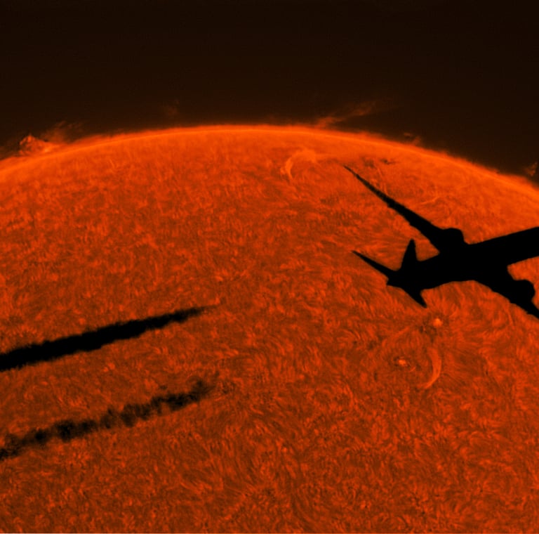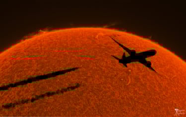 Lucky imaging a naprendszer látszólag apró égitestjeinek fotózására használatos eljárás. A folytonosan kavargó, örvenylő légkör folyamatosan szétmossa az égitestek apró képet, de véletlenszerűen lehetnek nyugodt pillanatok, amikor a kép tiszta. A fényképezés során több ezer képet készítünk, és ezekből kiválogatjuk a legjobb legszerencsésebb képeket, amit átlagolva megkapjuk a végső fotót. Már a jó képekhez is nagy szerencse kell ( innen adódik az eljárás neve is) de ahhoz, hogy a felvételek készítése közben egy arra tévedt repülő éppen átrepüljön a Nap előtt hatalmas mázli kell. A fenti képhez is nagy szerencse kellet, amíg a napkoronáról készítettem a képet, a túlexponált napfelszín előtt méltóságteljesen átrepült egy utasszállító, kitakarva a napfelszínt. A gép távozása után készítettem a napfelszínről is egy sorozatot, amit negatívba fordítva, hogy jobban kiemeljem a mélyben őrvénylő tűztengert összedolgoztam a repülővel tarkított napkorona képével. Igy született a fenti keskenysávú felvétel a Napunkról, és a szinte már mindenütt jelenlévő Emberről.