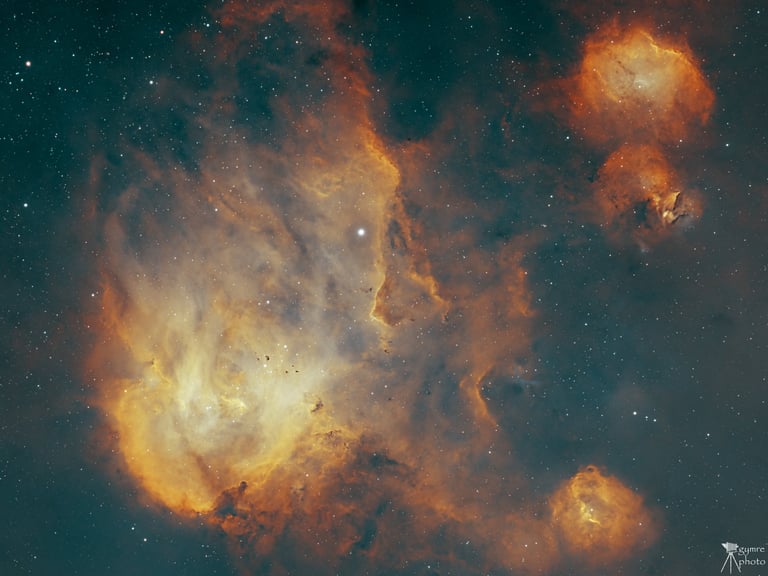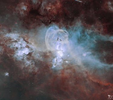 NGC 3576 - Statue of Liberty Nebula nevét a New Yorki Szabadság szoborra hasonlító alakjáról kapta. A ködösség kb. 9800 fényévre helyezkedik el tőlünk a Carina csillagképben. John Frederick William Herschel fedezte fel 1834. március 16-án. Aktív csillagkeletkezési régió, melynek belsejében a már megszületett forró csillagok által kibocsátott ultraibolya sugárzás a ködöt látványos fénykibocsájtásra készteti. Ez a csillagszél alakítja a köd formáját, érdekes alakzatait.