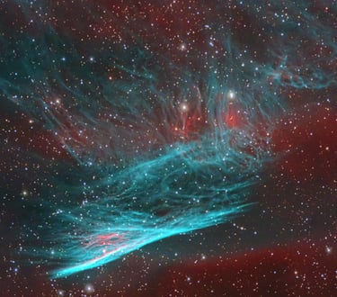 A hamisszínes feldolgozás a színes kamerás keskenysávú (Ha,Oiii) felvételekhez talán legjobban illeszkedő Foraxx dinamikus színpalettával készült.