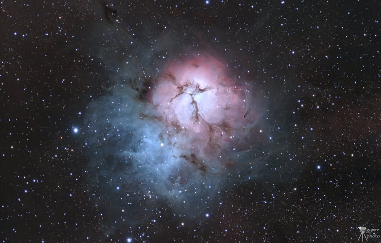 A deli égbolton a kedvenc objektumom a Nyilas csillagképben, tőlünk mintegy 4100 fényévre elhelyezkedő, Trifid köd , amely nevét (trifidus= három lebenyű) a ködöt három részre szabdaló sötét porsávról kapta. (A 18. századi felfedezésekor a negyedik halványabb porsávot még nem látták rendesen.)