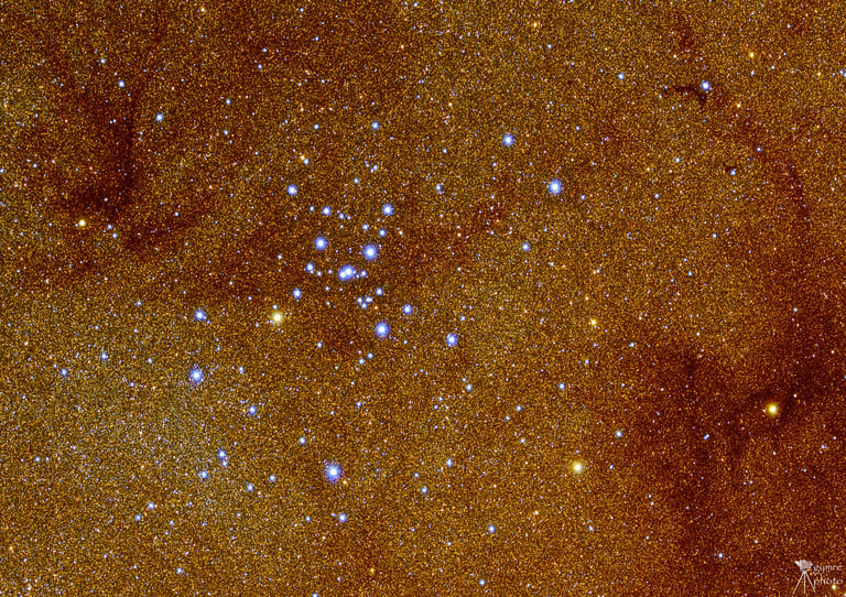 Namíbia nemcsak az állatvilágáról, hanem gyémántbányáiról is híres. De nem kell ahhoz a föld alá mennünk, hogy gyémántokat találjunk Namíbiában, elég ha felnézünk a csodálatosan tiszta és sötét égbolton keresztül a fejünk fölé, hogy igazi tündöklő, sziporkázó gyémántokat lássunk, rádásul arany szőnyegen szétszórva. A képen Charles Messier francia csillagász által hetes számon katalogizált M7 nyilthalmaz sziporkázó, fiatal kékes színű, forró csillagait látjuk a mögöttük lévő öregebb, sárgásabb csillagok milliárdjai előtt. Az M7 nyílthalmaz csillagai circa 800 fényév távolságra vannak tőlünk, és másodpercenként 14 km-es sebességgel közelednek felénk.
