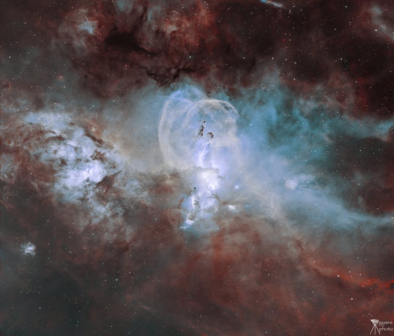 A fortyogó tűzben születő sárkánytojás jut eszünkbe ha megpillantjuk a Déli félteke Szögmérő csillagképében, a Naprendszertől 3870 fényévre található emissziós ködöt, amelyet John Herschel csillagász fedezett fel 1834-ben. A világító gázburkokat a köd közepén található, a Napunknál negyvenszer nagyobb csillag lökte ki magából, és intenzív ultraibolya fénye készteti fénylésre.