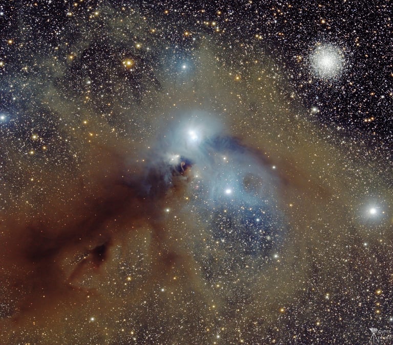 Az NGC 6726 objektum csak a déli féltekéről látható Corona Australis csillagképben található sötét csillagközi porból és megvilágított gázokból álló, hangyászra hasonlító képződmény. A barnás sötét por és molekulafelhő, ami kitakarja a mögötte lévő csillagokat alkotja a testét, a két forró kék csillag alkotja a szemét, egyben megvilágítva a körülötte lévő molekulafelhőt, ami kéken ragyog, egy keskeny elnyúlt sötét molekulafelhő alkotja az ormányt, és a képen egy hanygyaboly is látható, ami nem más mint egy jóval messzebb lévő gömbhalmaz.